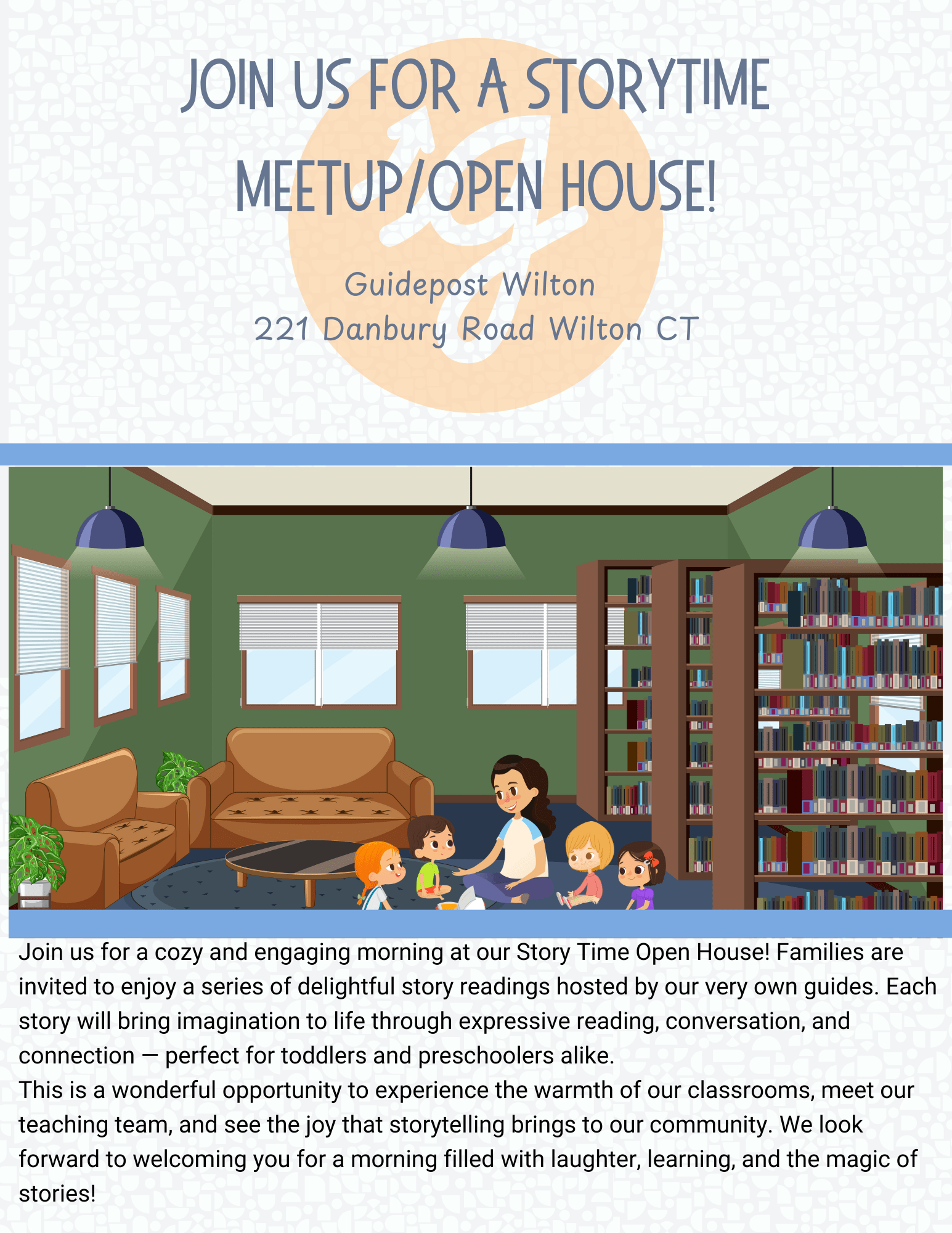 Guidepost Montessori at Wilton 211 Danbury Road, Wilton, CT, United StatesEvent: Story Time Open House Date: Sunday, November 9 Time: 10:00 AM – 12:00 PM Hosted by: Our wonderful Guides (Teachers) Join us for a cozy and engaging morning at our Story Time Open House! Families are invited to enjoy a series of delightful story readings hosted by our very own guides. Each story will…