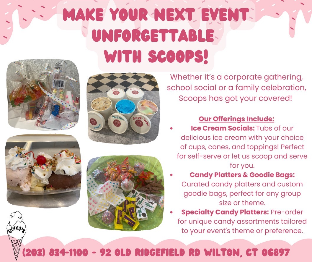 Scoops 92 Old Rigefield Road, Wilton, CT, United StatesPlanning a special event? Scoops can help with birthday parties, socials, and business events! Give us a call today and see how we can make your day a little sweeter!