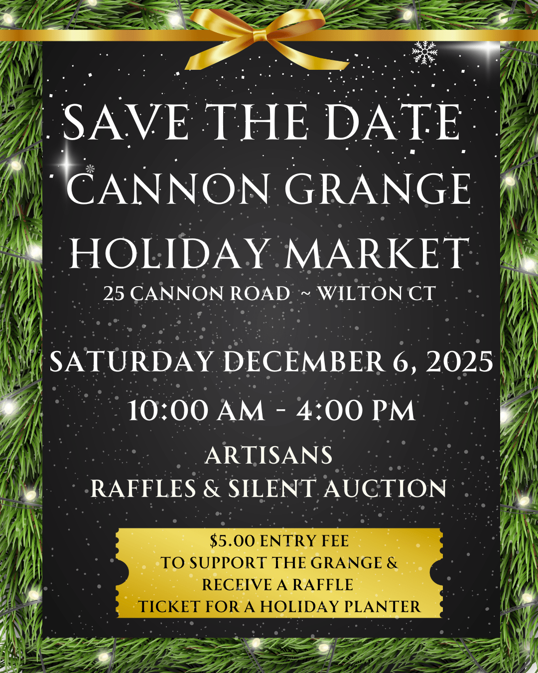 Save the Date Cannon Grange Holiday Artisan Market Stop by and shop with 19 amazing artisans selling their High Quality items. $5.00 Entry Supports the Historic Cannon Grange and you receive a Raffle Ticket to enter into ANY raffle or drop your ticket into the bucket to win a Holiday Planter!! Also - Bid on…