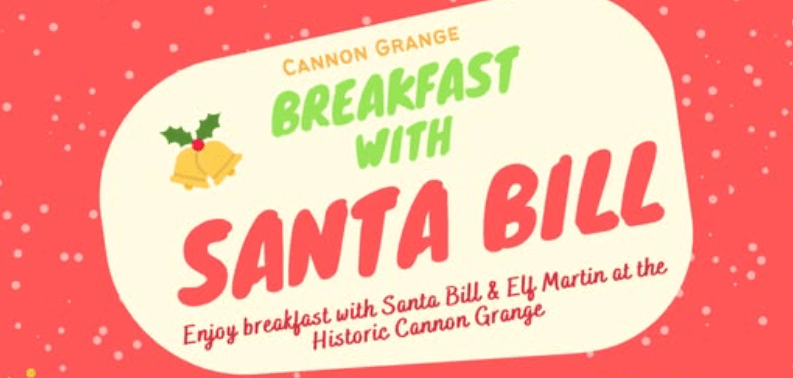 Enjoy Breakfast with Santa Bill & Elf Martin at the Historic Cannon Grange Your $12 per person ticket (kids under 2 are free) includes: Delicious Pancake Breakfast, Photo Opportunity with Santa, Face Painting & Music. A fun event for the whole family! Sunday November 30 (9-9:30, 10:15-11 or 11:30-12:15) Pick your Time Slot by registering…