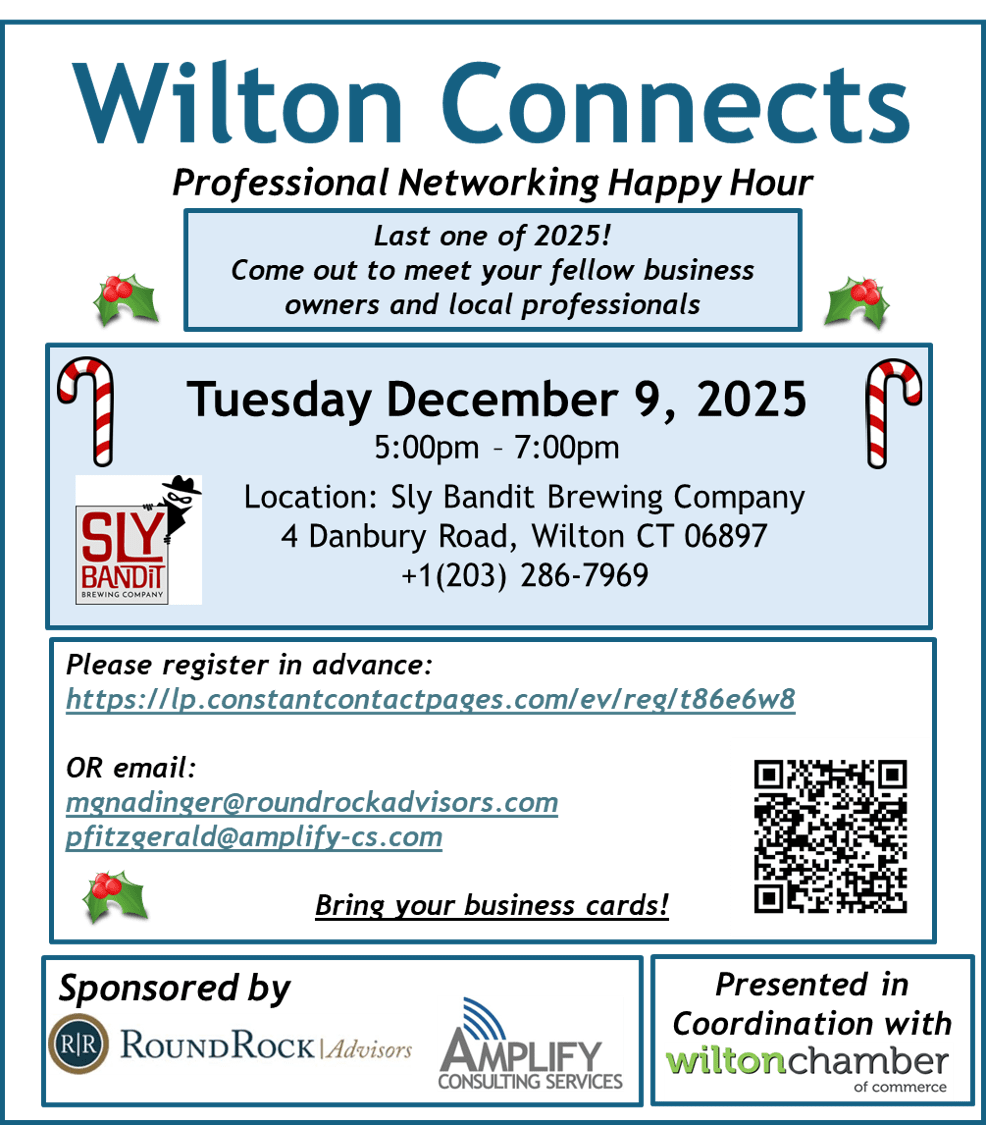 Wilton Connects Networking hosted by Chamber members, Round Rock Advisors  and Amplify Consulting Services invites you to join them for an evening of connections and conversations with your fellow business owners and professionals in Wilton, CT and the surrounding area. This event is free but registration is required. Register here: Wilton Connects Networking Event