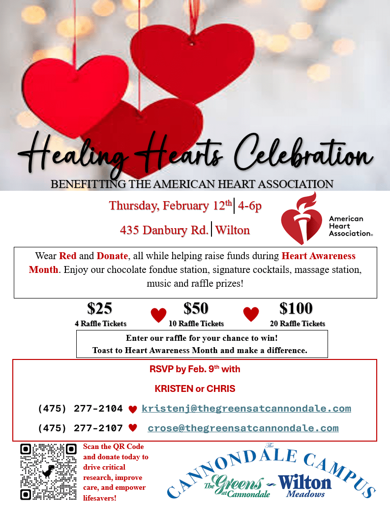 The Greens at Cannondale proudly presents, "Healing Hearts Celebration" benefiting the American Heart Association on Thursday Feb. 12th from 4-6pm at their Wilton campus - 435 Danbury Road. This is a fun opportunity to network, nosh, and support a great cause! RSVP by Feb. 9th with KRISTEN or CHRIS (475) 277-2104  - kristenj@thegreensatcannondale.com (475) 277-2107 …