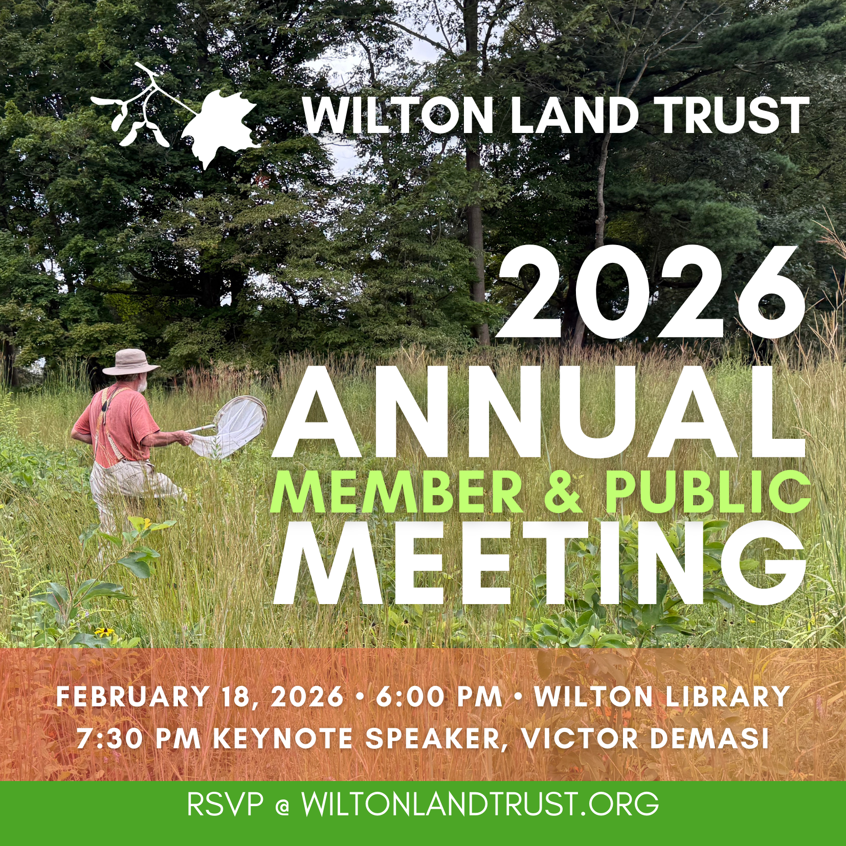 The Wilton Land Trust’s Annual Meeting is set for Wednesday, February 18 in the Brubeck Room at the Wilton Library. The member meeting is at 6:00pm, refreshments at 6:30pm, organizational highlights with Executive Director Whitney Beaman and President Craig Johnson at 7:00 pm, followed by a 7:30 pm keynote by entomologist Victor DeMasi on butterflies,…