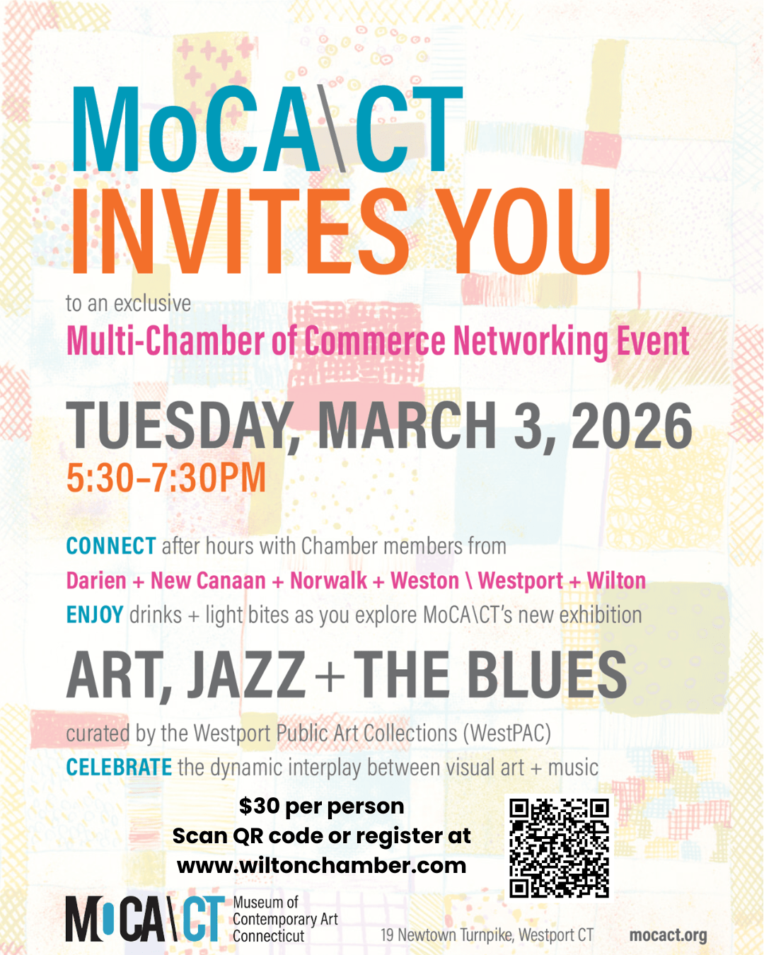 Join the Wilton Chamber of Commerce and our regional partners for a Multi-Chamber Networking After Hours at MoCA CT in Westport. Enjoy an evening of art, music, drinks, and light bites while connecting with fellow community leaders. Event update 3/1/26: Event is SOLD OUT.