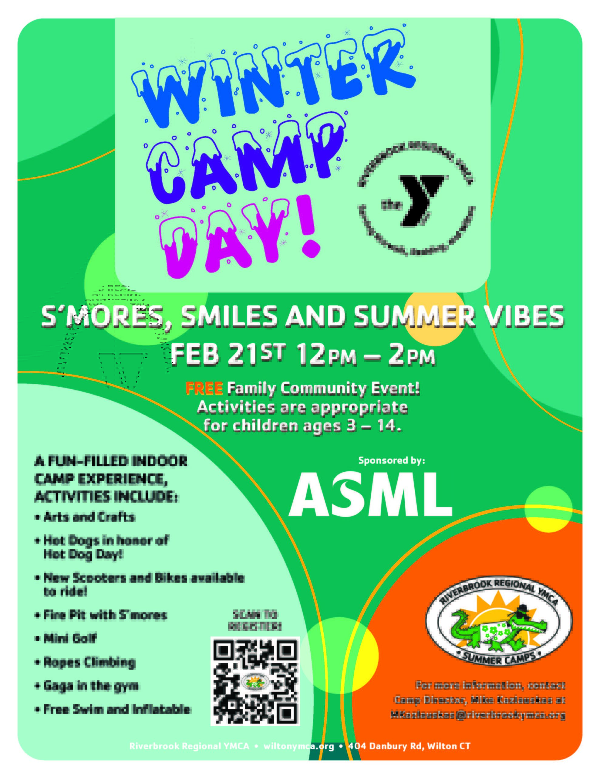 Join the Wilton YMCA for a free family event, sponsored by ASML, on February 21, 12 p.m. – 2 p.m Activities Include: Arts and Crafts, Hot Dogs in honor of Hot Dog Day, New Scooters and Bikes available to ride, Fire Pit with S’mores, Mini Golf, Ropes Climbing, Gaga in the gymnasium, and Free Swim…