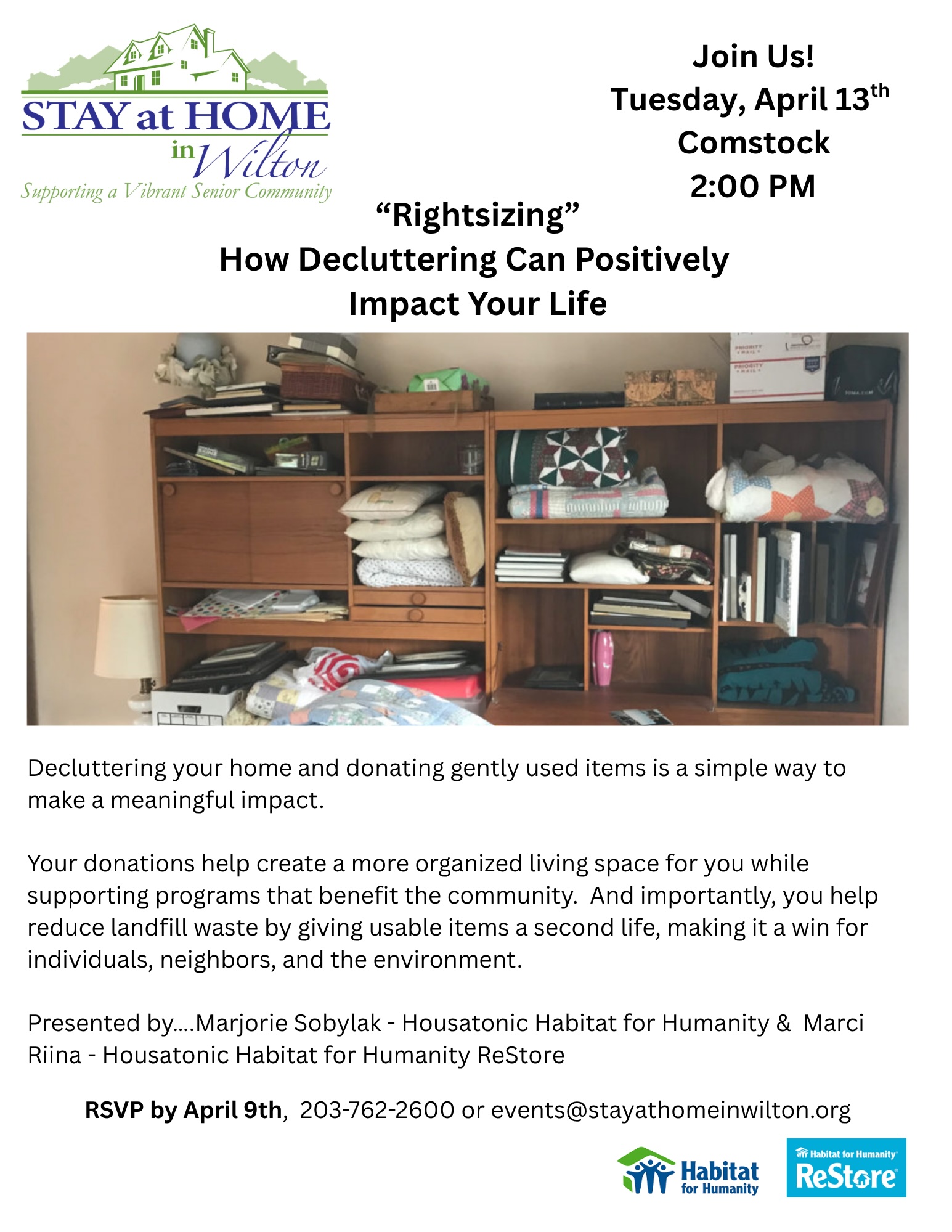 Decluttering your home and donating gently used items is a simple way to make a meaningful impact. Your donations help create a more organized living space for you while supporting programs that benefit the community. Presented by Habitat for Humanity. Monday, April 13th, 2PM, Comstock Community Center. RSVP at 203-762-2600 or events@stayathoneinwilton.org